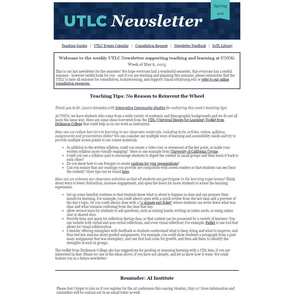 This is our last newsletter for the semester! We hope everyone had a wonderful semester, that everyone has a restful summer - however restful looks for you - and if you are teaching and planning this summer, please remember that the UTLC is here all summer for consultation, brainstorming, and support! Email utlc@uncg.edu or refer to our online consultation resources.