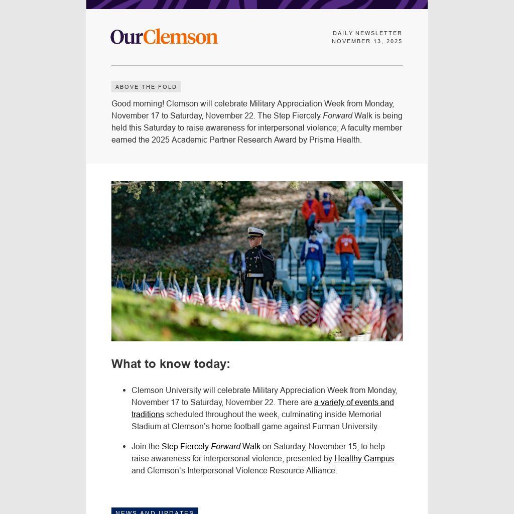 Good morning! Clemson will celebrate Military Appreciation Week from Monday, November 17 to Saturday, November 22. The Step Fiercely Forward Walk is being held this Saturday to raise awareness for interpersonal violence; A faculty member earned the 2025 Academic Partner Research Award by Prisma Health.