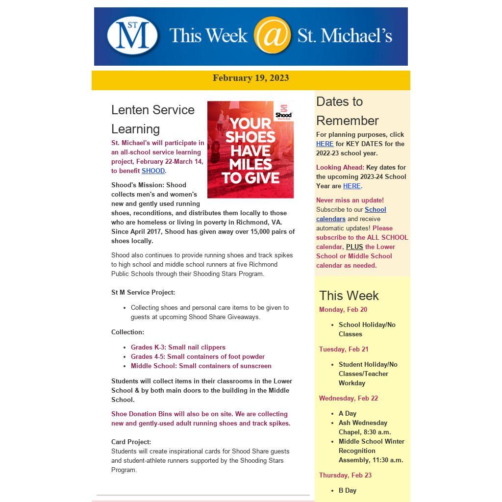 Ash Wednesday Chapel ServiceSt. Michael's will administer ashes at the Wednesday, February 22, chapel service to all students who wish to receive them. All children will walk forward with their classmates, though if any students do not wish to receive ashes, they may cross their arms over their chests to receive a simple blessing. Please talk with your child(ren) about your own faith tradition(s) and how that informs your family's choice about how they will participate.
