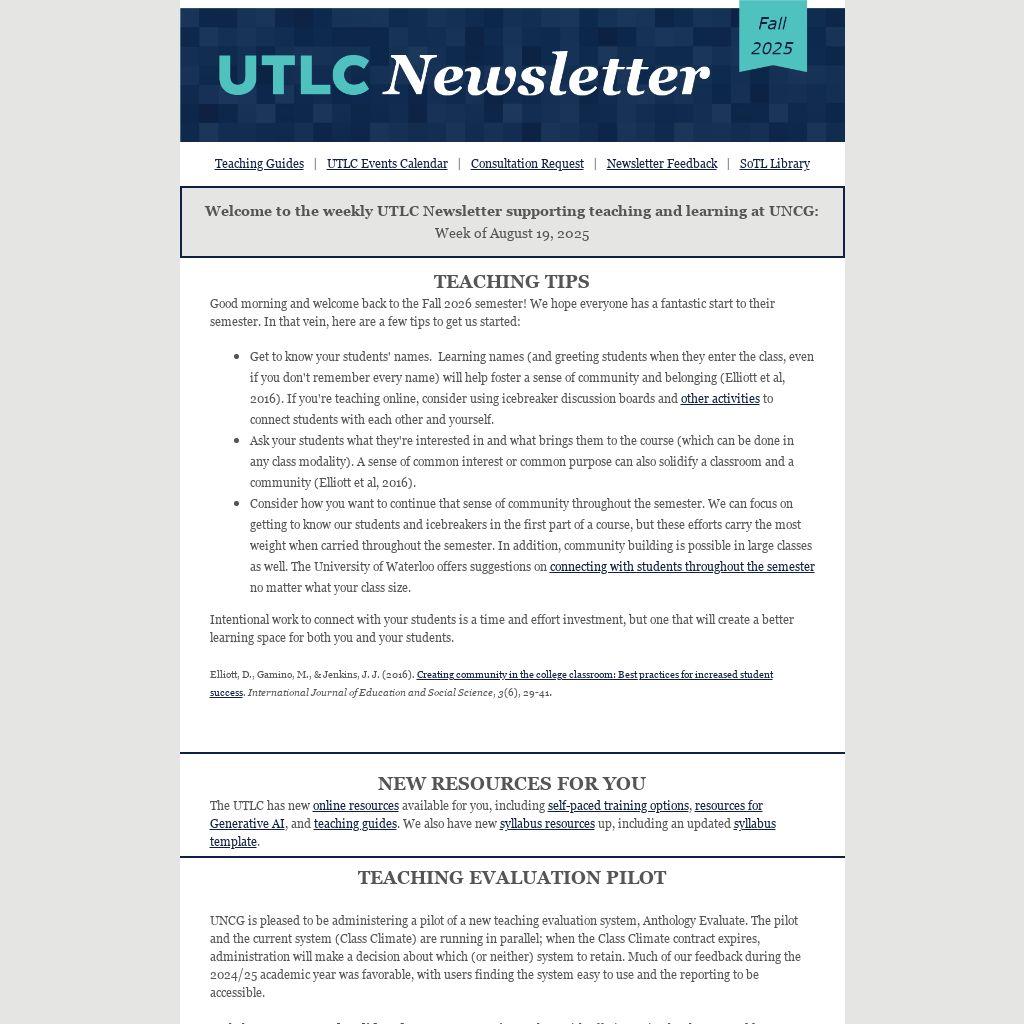 Welcome to the weekly UTLC Newsletter supporting teaching and learning at UNCG: