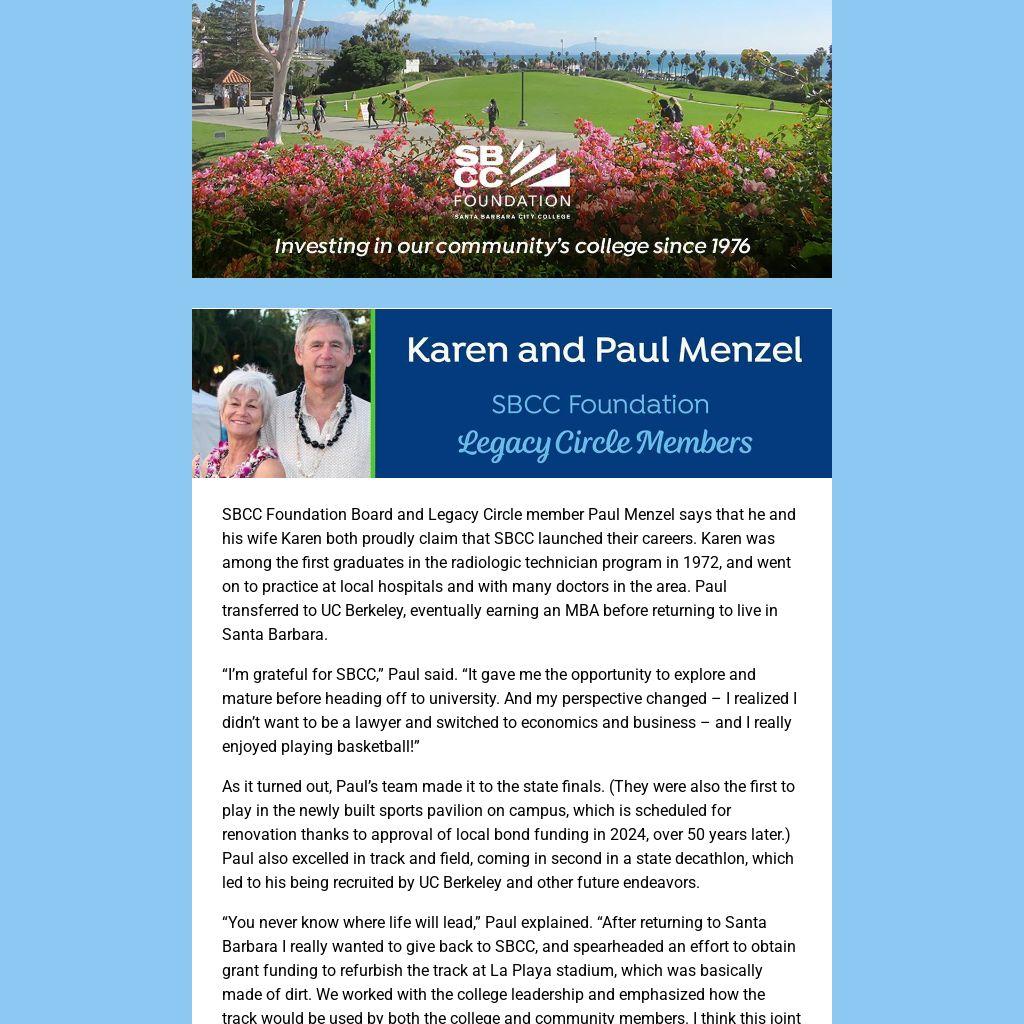 SBCC Foundation Board and Legacy Circle member Paul Menzel says that he and his wife Karen both proudly claim that SBCC launched their careers. Karen was among the first graduates in the radiologic technician program in 1972, and went on to practice at local hospitals and with many doctors in the area. Paul transferred to UC Berkeley, eventually earning an MBA before returning to live in Santa Barbara.