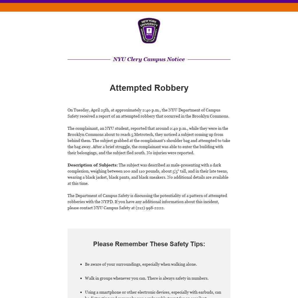 On Tuesday, April 25th, at approximately 2:40 p.m., the NYU Department of Campus Safety received a report of an attempted robbery that occurred in the Brooklyn Commons.