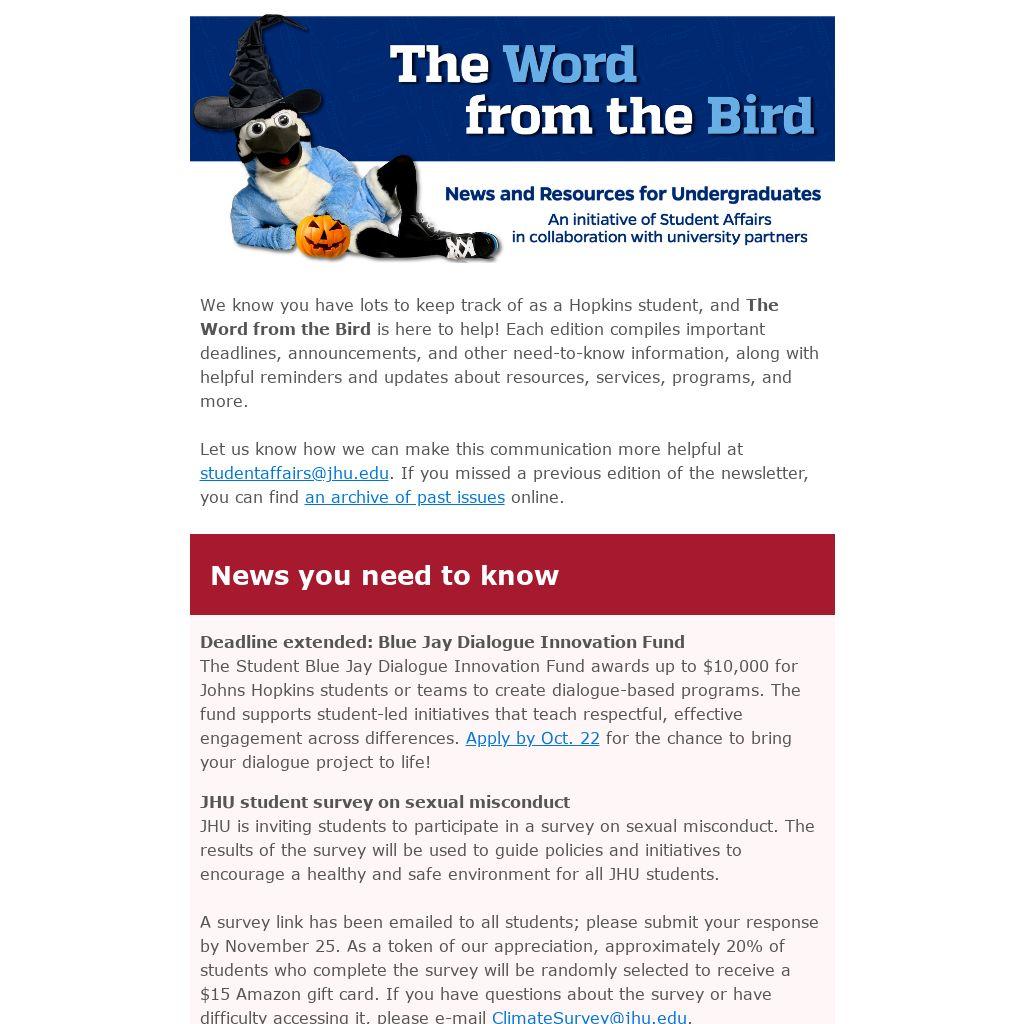 We know you have lots to keep track of as a Hopkins student, and The Word from the Bird is here to help! Each edition compiles important deadlines, announcements, and other need-to-know information, along with helpful reminders and updates about resources, services, programs, and more.