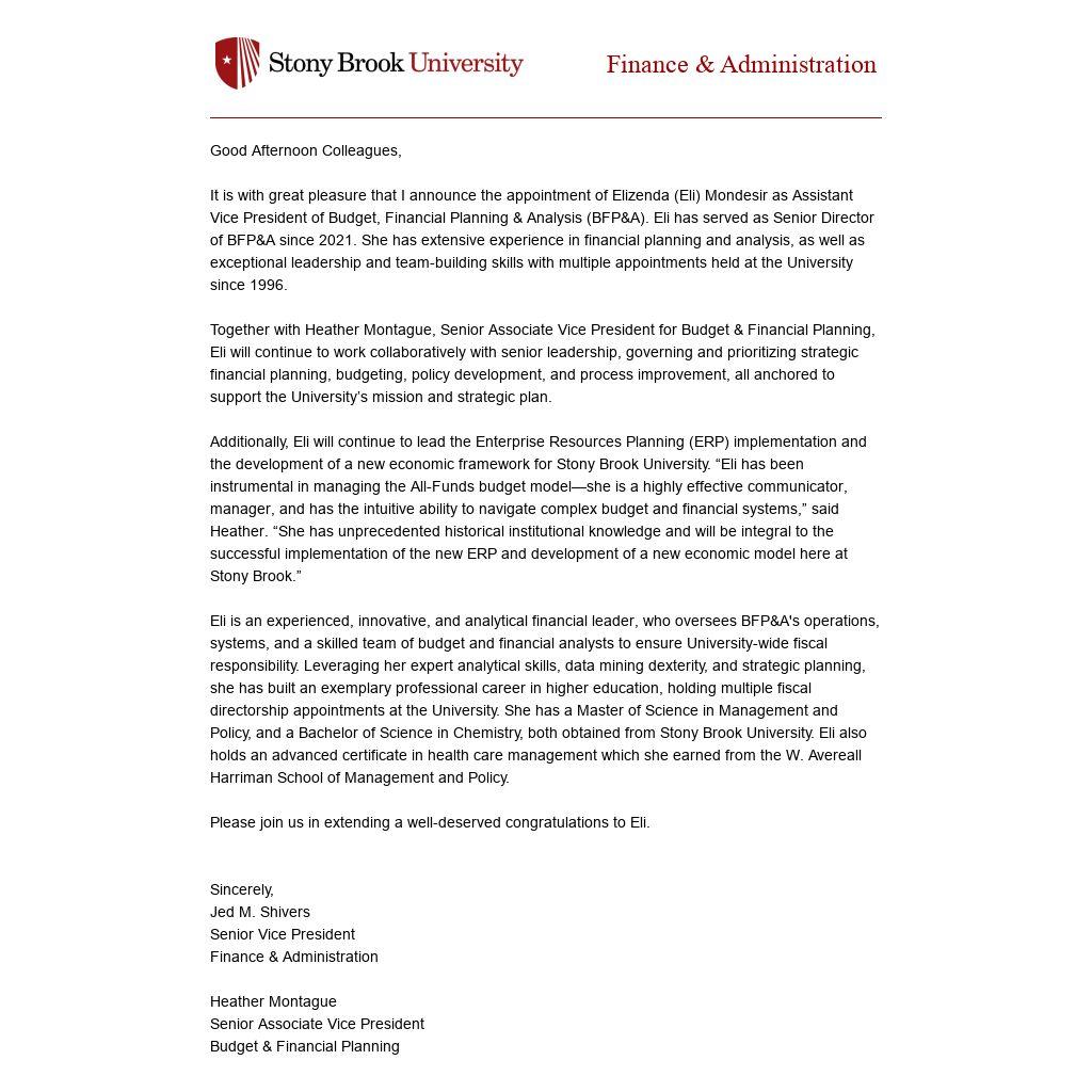 It is with great pleasure that I announce the appointment of Elizenda (Eli) Mondesir as Assistant Vice President of Budget, Financial Planning & Analysis (BFP&A). Eli has served as Senior Director of BFP&A since 2021. She has extensive experience in financial planning and analysis, as well as exceptional leadership and team-building skills with multiple appointments held at the University since 1996.
