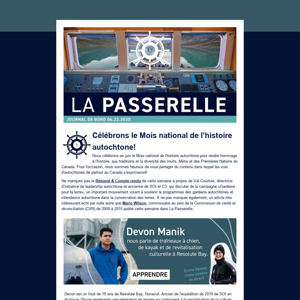 Devon est un Inuit de 19 ans de Resolute Bay, Nunavut. Ancien de l'expédition de 2019 de SOI en Arctique, Devon représente une génération de jeunes qui participent à la revitalisation de la culture inuite chez les jeunes. Son amie d'expédition, Emma Denton, de l'Irlande du Nord, l'interviewera en direct, le 30 juin 2020, à 15h (HNE). Ne manquez pas ça! Recevez un rappel