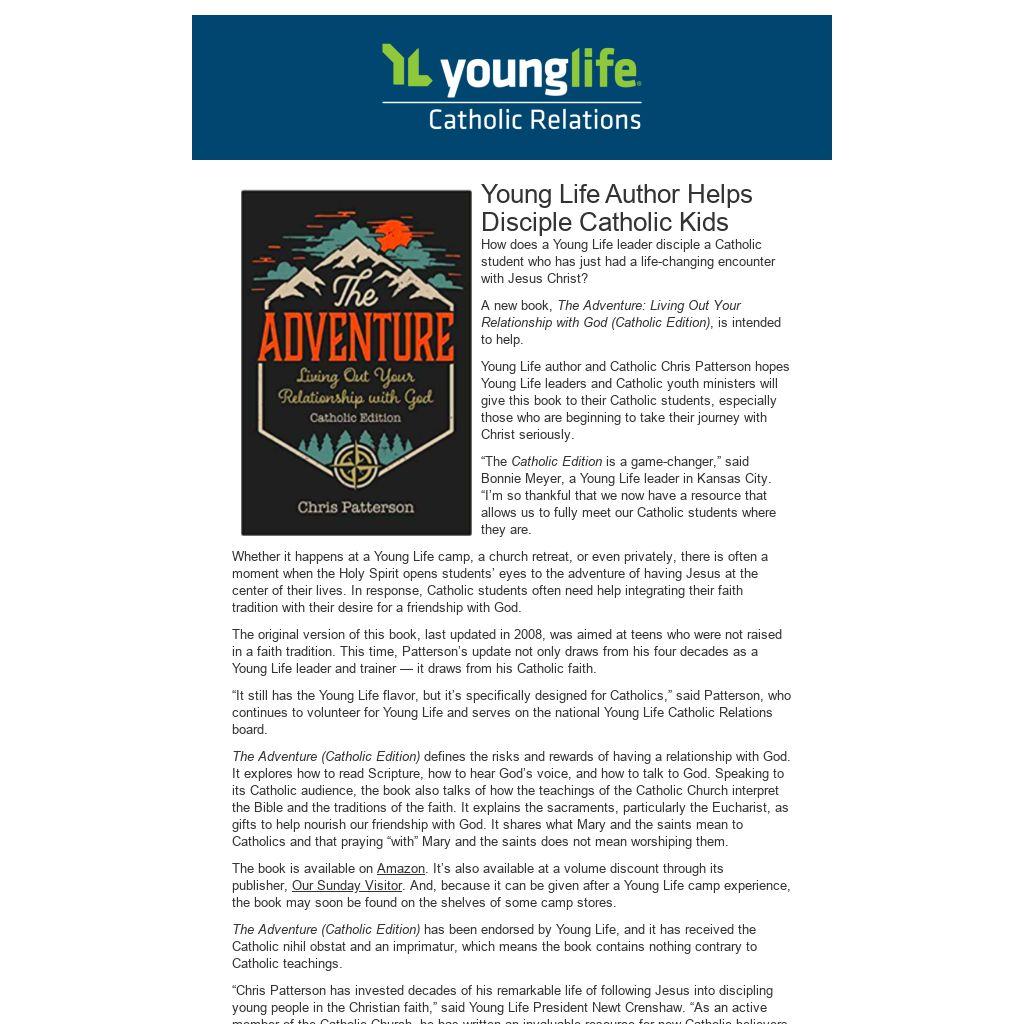 “Chris Patterson has invested decades of his remarkable life of following Jesus into discipling young people in the Christian faith,” said Young Life President Newt Crenshaw. “As an active member of the Catholic Church, he has written an invaluable resource for new Catholic believers who want to live out their relationship with our God, who invites us all into His great ‘Adventure.’”