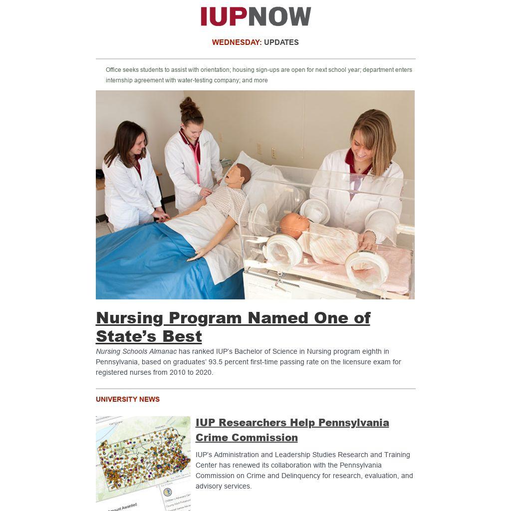 Distributed to IUP employees and students three days a week, IUP Now is the official newsletter of Indiana University of Pennsylvania. It features news from across the IUP website, compiled by the Division of Marketing and Communications. Find out how to get your news and events in IUP Now.