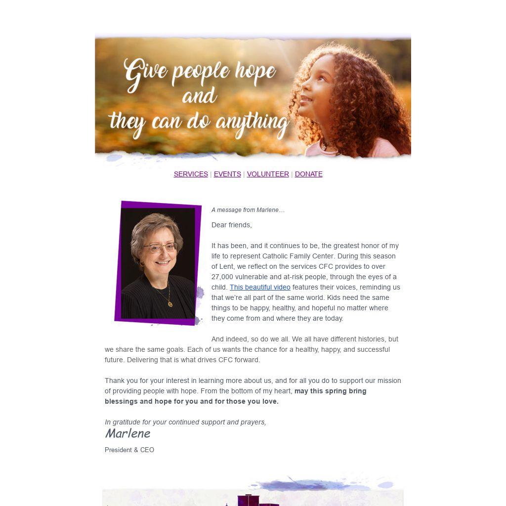 It has been, and it continues to be, the greatest honor of my life to represent Catholic Family Center. During this season of Lent, we reflect on the services CFC provides to over 27,000 vulnerable and at-risk people, through the eyes of a child.