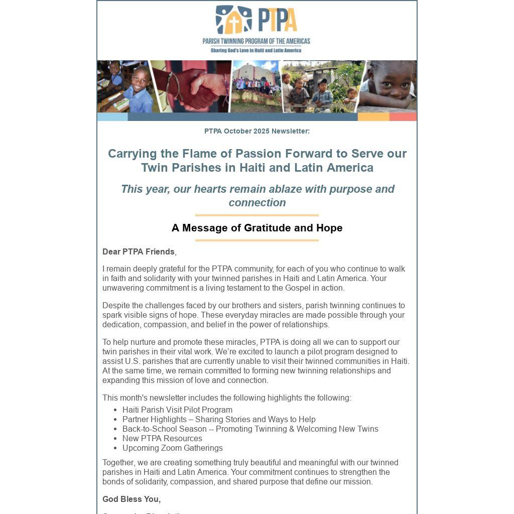 I remain deeply grateful for the PTPA community, for each of you who continue to walk in faith and solidarity with your twinned parishes in Haiti and Latin America. Your unwavering commitment is a living testament to the Gospel in action.