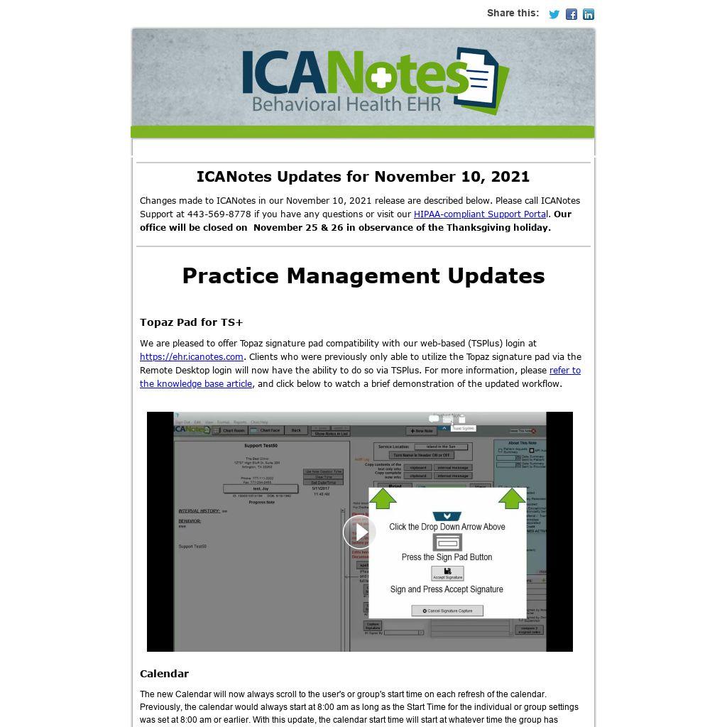 Changes made to ICANotes in our November 10, 2021 release are described below. Please call ICANotes Support at 443-569-8778 if you have any questions or visit our HIPAA-compliant Support Portal. Our office will be closed on  November 25 & 26 in observance of the Thanksgiving holiday.