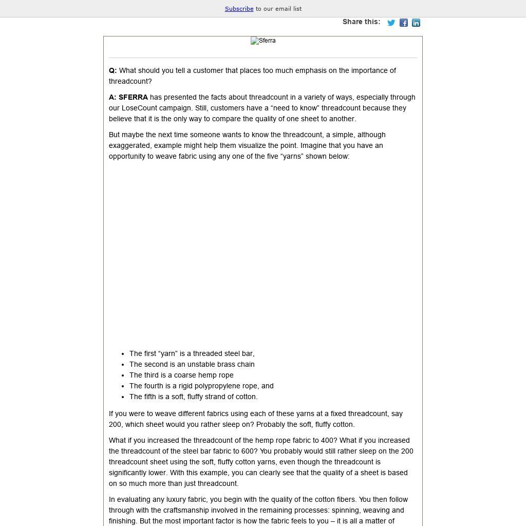 What if you increased the threadcount of the hemp rope fabric to 400? What if you increased the threadcount of the steel bar fabric to 600? You probably would still rather sleep on the 200 threadcount sheet using the soft, fluffy cotton yarns, even though the threadcount is significantly lower. With this example, you can clearly see that the quality of a sheet is based on so much more than just threadcount.