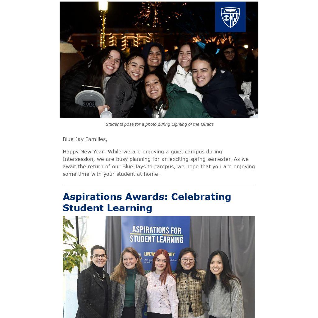 Last month, JHU Student Affairs held a new event to honor students and staff who exemplify the Aspirations for Student Learning, the five key learning outcomes that we hope students will develop through their out-of-classroom experiences: curiosity, self-awareness, collaboration, confidence, and responsible leadership.
