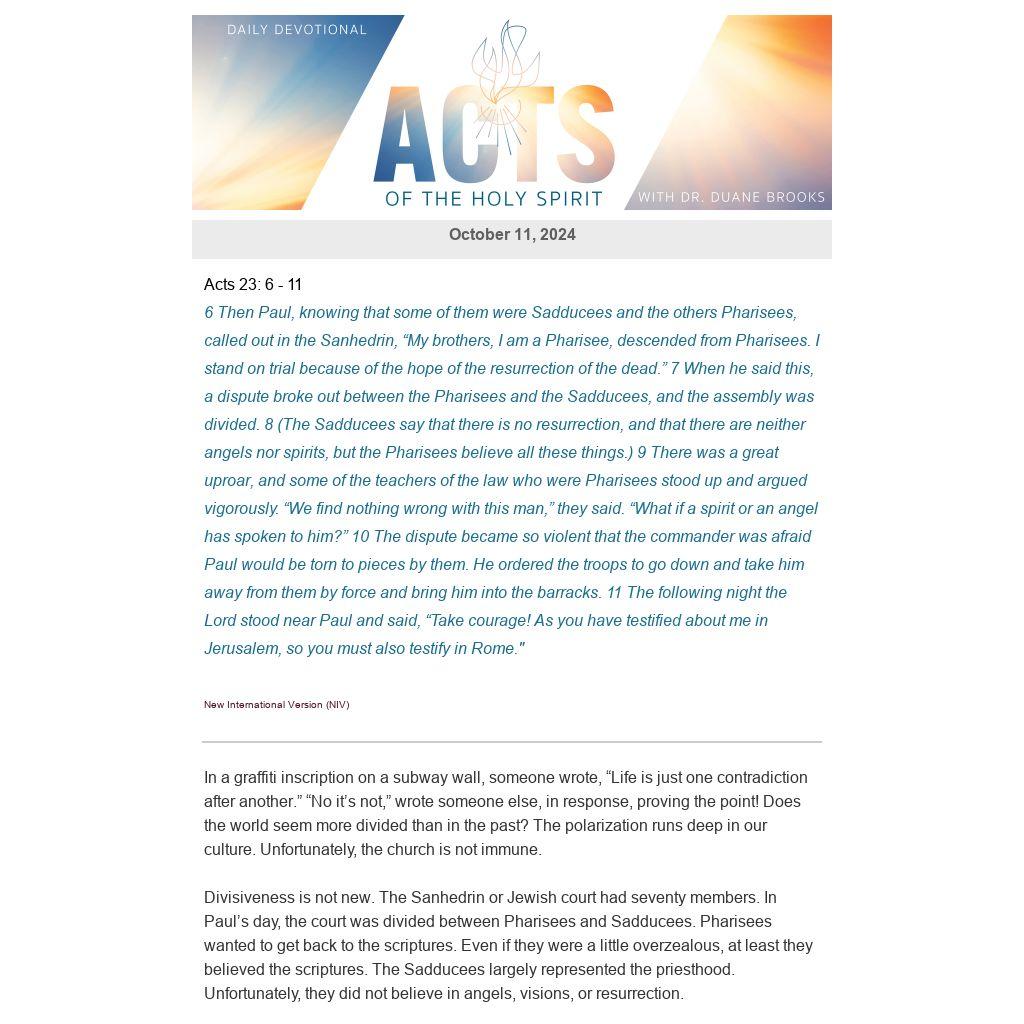 Divisiveness is not new. The Sanhedrin or Jewish court had seventy members. In Paul’s day, the court was divided between Pharisees and Sadducees. Pharisees wanted to get back to the scriptures. Even if they were a little overzealous, at least they believed the scriptures. The Sadducees largely represented the priesthood. Unfortunately, they did not believe in angels, visions, or resurrection.