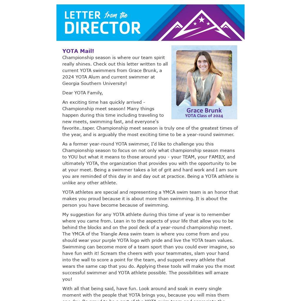 As a former year-round YOTA swimmer, I’d like to challenge you this Championship season to focus on not only what championship season means to YOU but what it means to those around you - your TEAM, your FAMILY, and ultimately YOTA, the organization that provides you with the opportunity to be at your meet. Being a swimmer takes a lot of grit and hard work and I am sure you are reminded of this day in and day out at practice. Being a YOTA athlete is unlike any other athlete.