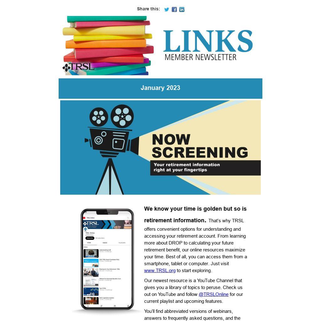 Fiscal sessions are limited to subject matters related to the state’s finances; however lawmakers can file up to five “general” subject bills. We will be monitoring all bills that impact TRSL and its members. Click here for some additional information about retirement bills. Visit our Legislation page to get the latest information on bills that impact TRSL. You can also sign up for eNews updates here to receive important legislative updates directly in your inbox. Already signed up? Click on the “manage your preferences” link at the bottom of this email to make sure you have “legislation” checked as a topic of interest.