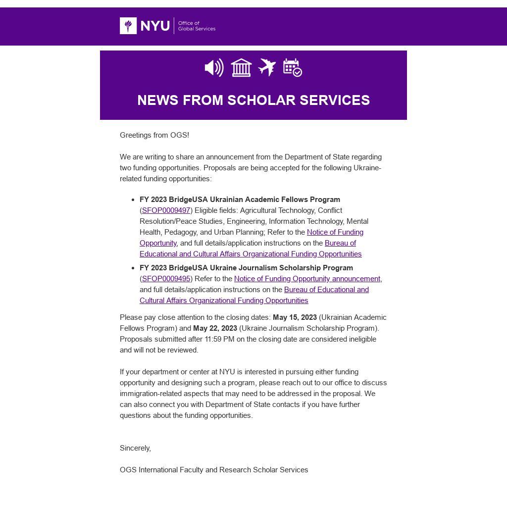 If your department or center at NYU is interested in pursuing either funding opportunity and designing such a program, please reach out to our office to discuss immigration-related aspects that may need to be addressed in the proposal. We can also connect you with Department of State contacts if you have further questions about the funding opportunities.