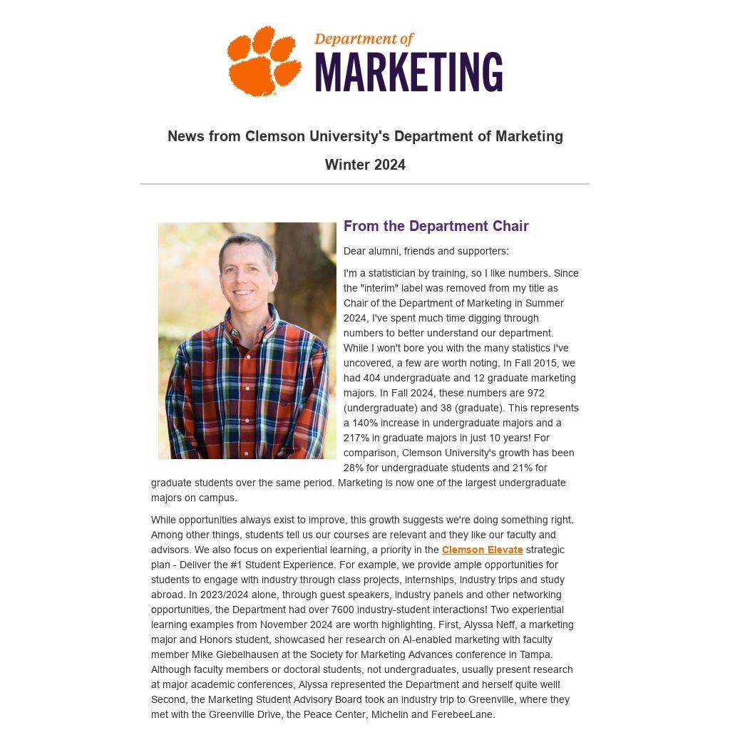 I'm a statistician by training, so I like numbers. Since the "interim" label was removed from my title as Chair of the Department of Marketing in Summer 2024, I've spent much time digging through numbers to better understand our department. While I won't bore you with the many statistics I've uncovered, a few are worth noting. In Fall 2015, we had 404 undergraduate and 12 graduate marketing majors. In Fall 2024, these numbers are 972 (undergraduate) and 38 (graduate). This represents a 140% increase in undergraduate majors and a 217% in graduate majors in just 10 years! For comparison, Clemson University's growth has been 28% for undergraduate students and 21% for graduate students over the same period. Marketing is now one of the largest undergraduate majors on campus.