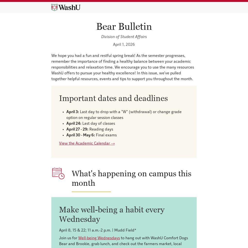 We hope you had a fun and restful spring break! As the semester progresses, remember the importance of finding a healthy balance between your academic responsibilities and relaxation time. We encourage you to use the many resources WashU offers to pursue your healthy excellence! In this issue, we’ve pulled together helpful resources, events and tips to support you throughout the month.
