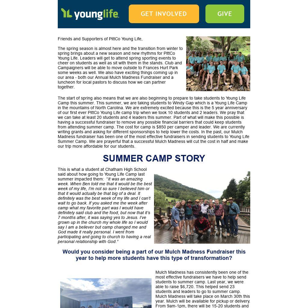 The spring season is almost here and the transition from winter to spring brings about a new season and new rhythms for PittCo Young Life. Leaders will get to attend spring sporting events to cheer on students as well as sit with them in the stands. Club and Campaigners will be able to move outside to Frances Hurt Park some weeks as well. We also have exciting things coming up in our area - both our Annual Mulch Madness Fundraiser and a luncheon for local pastors to discuss how we can partner together.