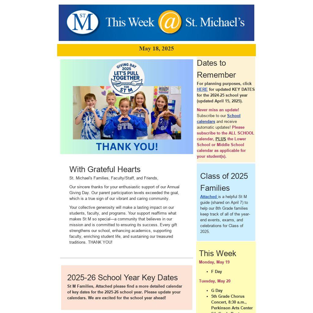 St M Families, Attached please find a more detailed calendar of key dates for the 2025-26 school year. Please update your calendars. We are excited for the school year ahead!