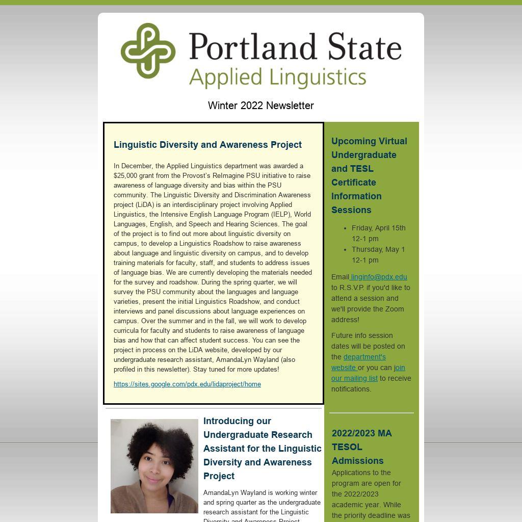 Linguistic Diversity and Awareness Project In December, the Applied Linguistics department was awarded a $25,000 grant from the Provost’s ReImagine PSU initiative to raise awareness of language diversity and bias within the PSU community. The Linguistic Diversity and Discrimination Awareness project (LiDA) is an interdisciplinary project involving Applied Linguistics, the Intensive English Language Program (IELP), World Languages, English, and Speech and Hearing Sciences. The goal of the project is to find out more about linguistic diversity on campus, to develop a Linguistics Roadshow to raise awareness about language and linguistic diversity on campus, and to develop training materials for faculty, staff, and students to address issues of language bias. We are currently developing the materials needed for the survey and roadshow. During the spring quarter, we will survey the PSU community about the languages and language varieties, present the initial Linguistics Roadshow, and conduct interviews and panel discussions about language experiences on campus. Over the summer and in the fall, we will work to develop curricula for faculty and students to raise awareness of language bias and how that can affect student success. You can see the project in process on the LiDA website, developed by our undergraduate research assistant, AmandaLyn Wayland (also profiled in this newsletter). Stay tuned for more updates!
