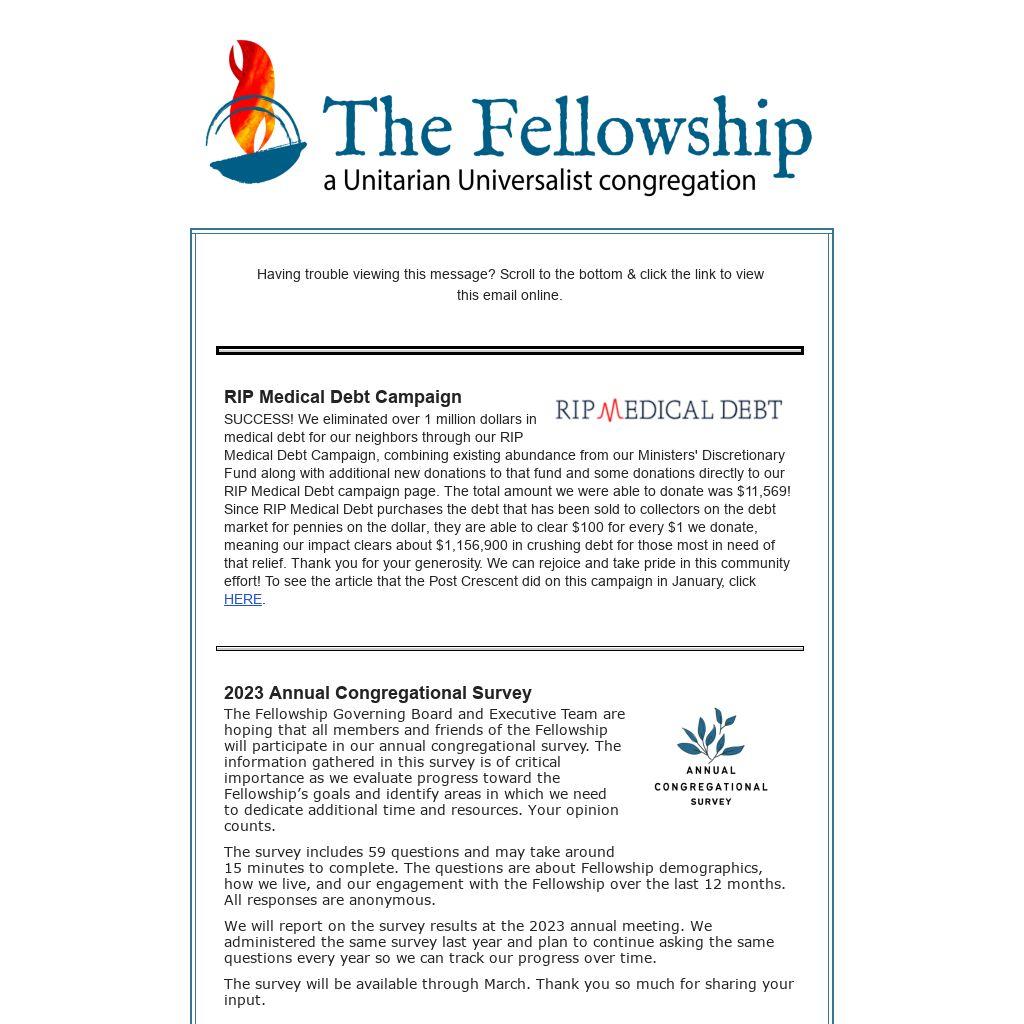 2023 Annual Congregational SurveyThe Fellowship Governing Board and Executive Team are hoping that all members and friends of the Fellowship will participate in our annual congregational survey. The information gathered in this survey is of critical importance as we evaluate progress toward the Fellowship’s goals and identify areas in which we need to dedicate additional time and resources. Your opinion counts.