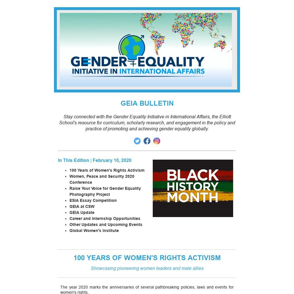 Stay connected with the Gender Equality Initiative in International Affairs, the Elliott School's resource for curriculum, scholarly research, and engagement in the policy and practice of promoting and achieving gender equality globally.