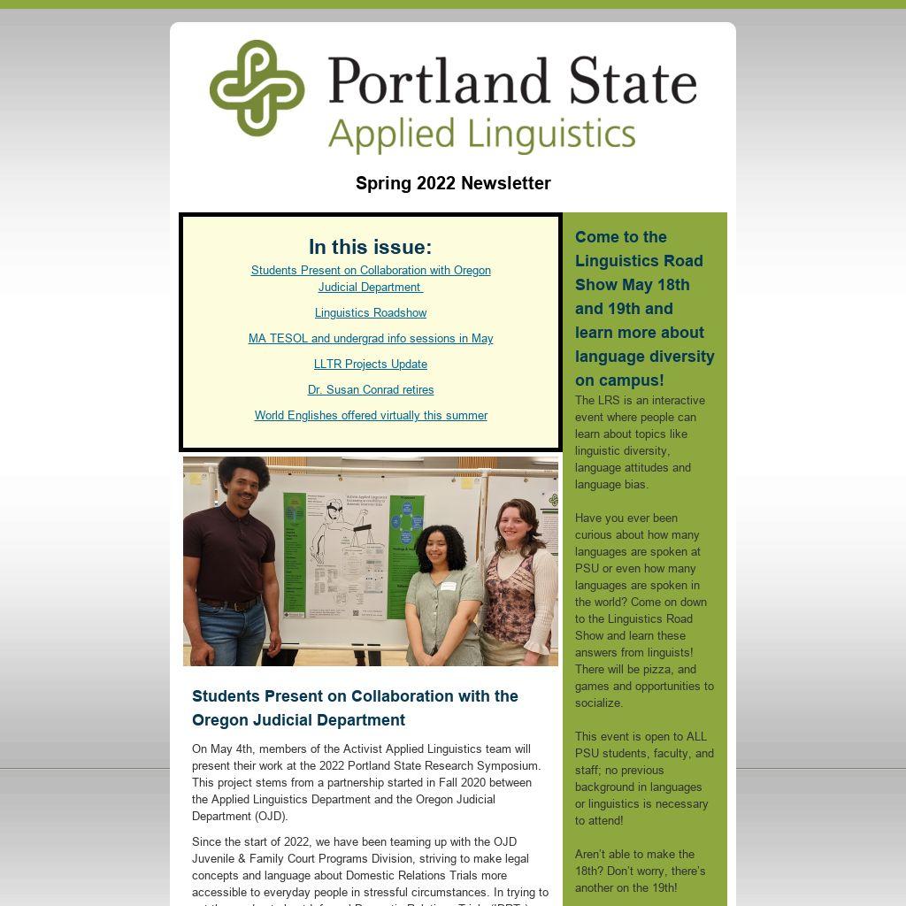 On May 4th, members of the Activist Applied Linguistics team will present their work at the 2022 Portland State Research Symposium. This project stems from a partnership started in Fall 2020 between the Applied Linguistics Department and the Oregon Judicial Department (OJD).