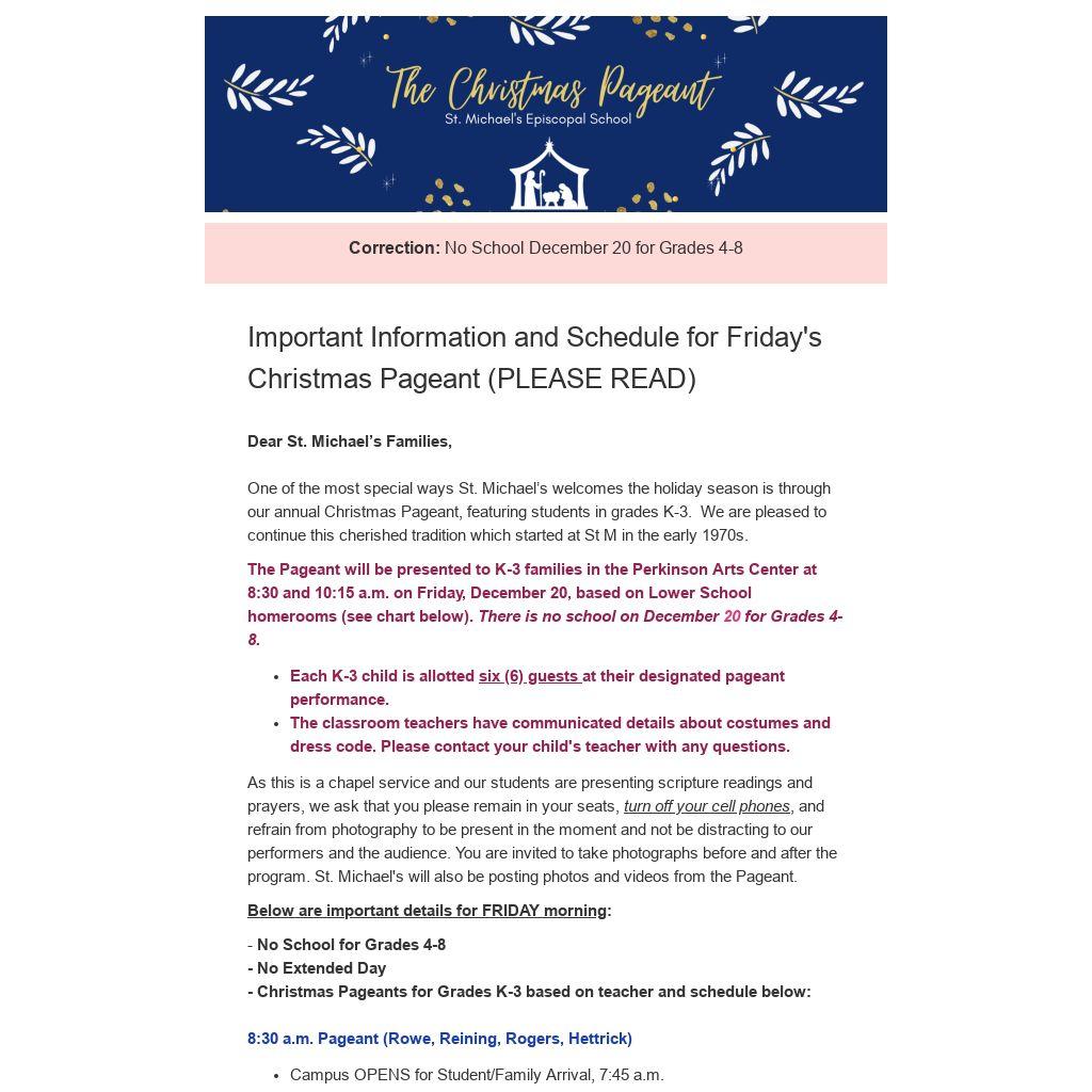 As this is a chapel service and our students are presenting scripture readings and prayers, we ask that you please remain in your seats, turn off your cell phones, and refrain from photography to be present in the moment and not be distracting to our performers and the audience. You are invited to take photographs before and after the program. St. Michael's will also be posting photos and videos from the Pageant.