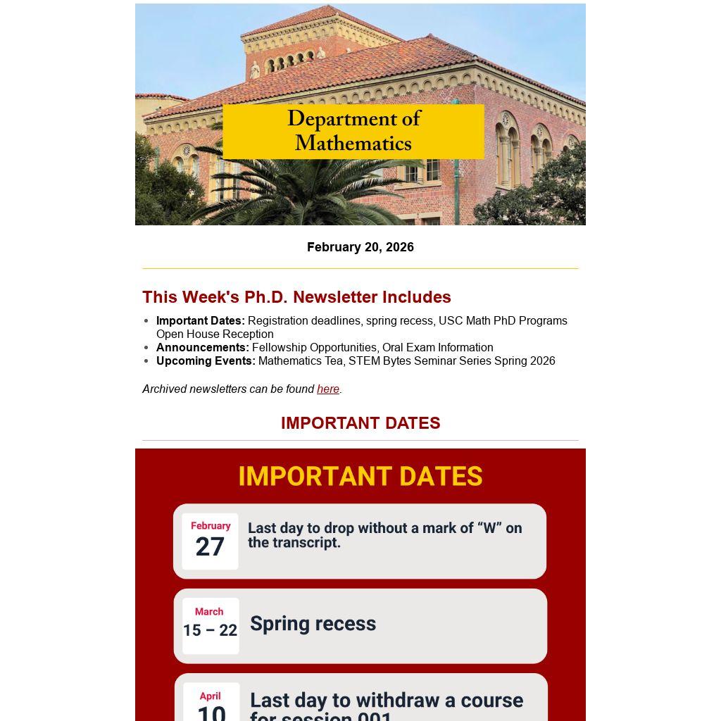 Important Dates: Registration deadlines, spring recess, USC Math PhD Programs Open House Reception