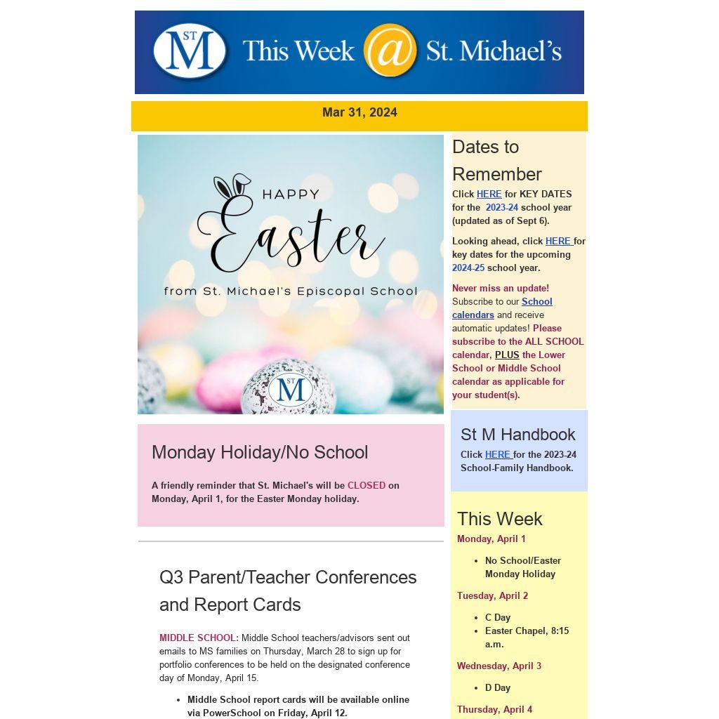 A friendly reminder that St. Michael's will be CLOSED on Monday, April 1, for the Easter Monday holiday.