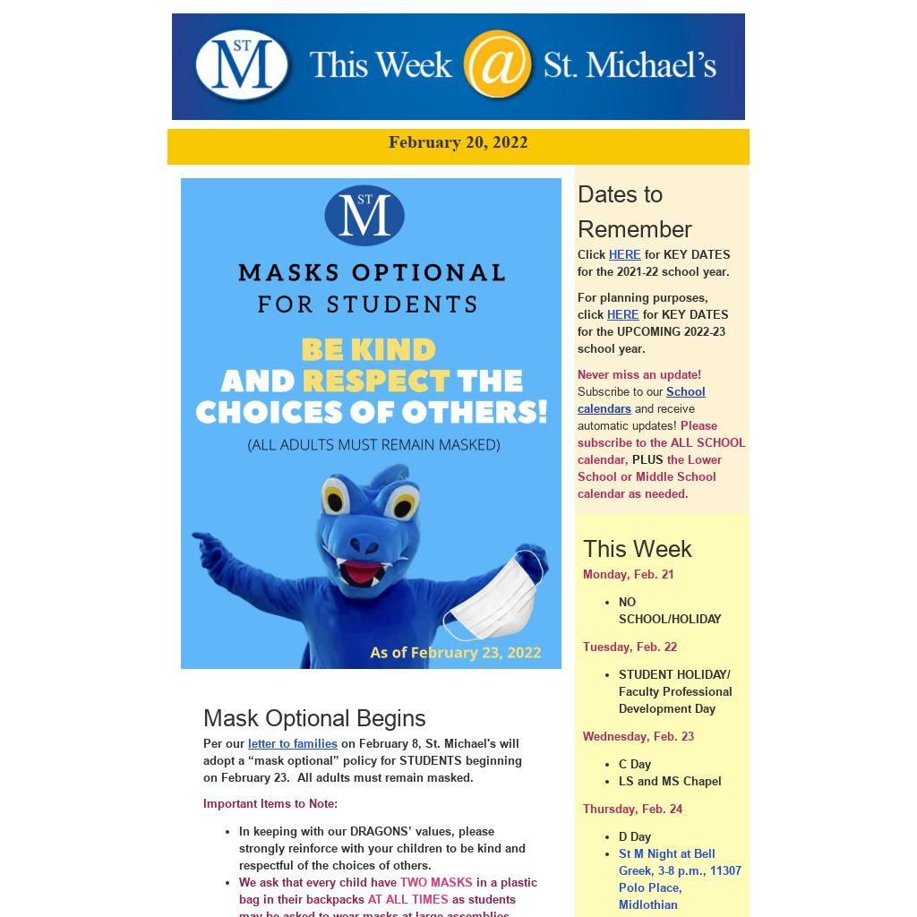 Per our letter to families on February 8, St. Michael's will adopt a “mask optional” policy for STUDENTS beginning on February 23. All adults must remain masked.