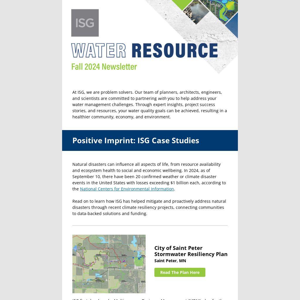 At ISG, we are problem solvers. Our team of planners, architects, engineers, and scientists are committed to partnering with you to help address your water management challenges. Through expert insights, project success stories, and resources, your water quality goals can be achieved, resulting in a healthier community, economy, and environment.