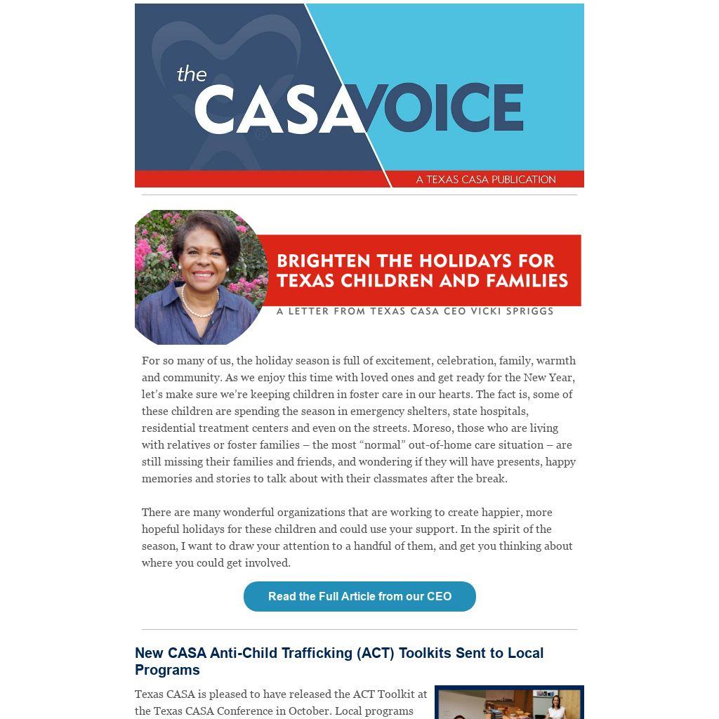 As you enjoy the holiday season with loved ones, we hope you remember the needs of the children and families experiencing the child welfare system, and the remarkable local CASA programs supporting them. Texas CASA has put together a wishlist page on our website with links to many of the local CASA program holiday wishlists. We encourage you to find your local program and help create a happier, more hopeful holiday season for children and families in need. Can't find your local program on the list? Visit texascasa.org/who-we-are/local-casa/ to contact them directly.