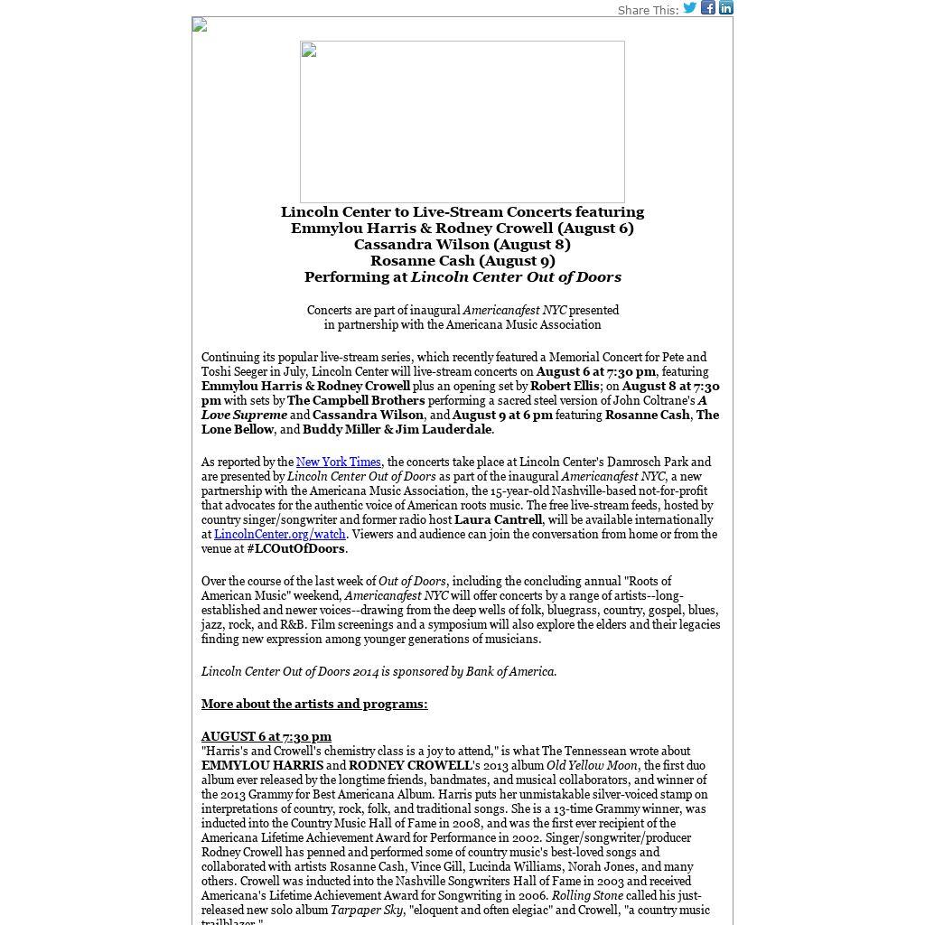 Continuing its popular live-stream series, which recently featured a Memorial Concert for Pete and Toshi Seeger in July, Lincoln Center will live-stream concerts on August 6 at 7:30 pm, featuring Emmylou Harris & Rodney Crowell plus an opening set by Robert Ellis; on August 8 at 7:30 pm with sets by The Campbell Brothers performing a sacred steel version of John Coltrane's A Love Supreme and Cassandra Wilson, and August 9 at 6 pm featuring Rosanne Cash, The Lone Bellow, and Buddy Miller & Jim Lauderdale.As reported by the New York Times, the concerts take place at Lincoln Center's Damrosch Park and are presented by Lincoln Center Out of Doors as part of the inaugural Americanafest NYC, a new partnership with the Americana Music Association, the 15-year-old Nashville-based not-for-profit that advocates for the authentic voice of American roots music. The free live-stream feeds, hosted by country singer/songwriter and former radio host Laura Cantrell, will be available internationally at LincolnCenter.org/watch. Viewers and audience can join the conversation from home or from the venue at #LCOutOfDoors.Over the course of the last week of Out of Doors, including the concluding annual "Roots of American Music" weekend, Americanafest NYC will offer concerts by a range of artists--long-established and newer voices--drawing from the deep wells of folk, bluegrass, country, gospel, blues, jazz, rock, and R&B. Film screenings and a symposium will also explore the elders and their legacies finding new expression among younger generations of musicians.Lincoln Center Out of Doors 2014 is sponsored by Bank of America.