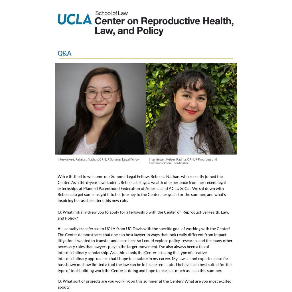 We're thrilled to welcome our Summer Legal Fellow, Rebecca Nathan, who recently joined the Center. As a third-year law student, Rebecca brings a wealth of experience from her recent legal externships at Planned Parenthood Federation of America and ACLU SoCal. We sat down with Rebecca to get some insight into her journey to the Center, her goals for the summer, and what’s inspiring her as she enters this new role.