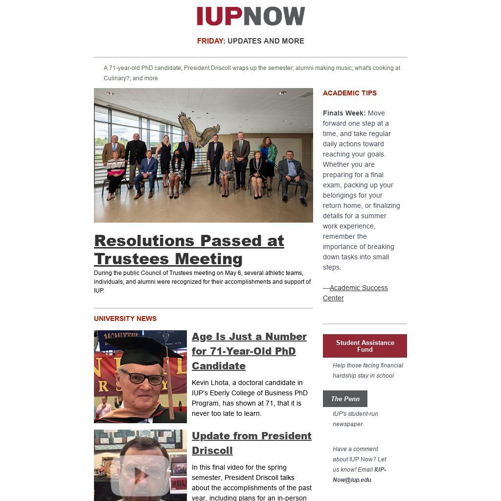 Distributed to IUP employees and students four days a week, IUP Now is the official newsletter of Indiana University of Pennsylvania. It features news from across the IUP website, compiled by the Division of Marketing and Communications. Find out how to get your news and events in IUP Now.