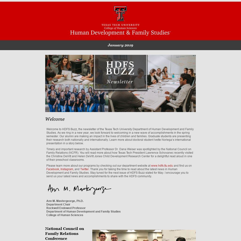 Welcome to HDFS Buzz, the newsletter of the Texas Tech University Department of Human Development and Family Studies. As we ring in a new year, we look forward to welcoming in a new wave of accomplishments in the spring semester. Our alumni are making an impact in the lives of children and families. Graduate students are presenting their research both nationally and internationally. Learn more about doctoral student Ivette Noriega’s international presentation in a story below. Timely and important research by Assistant Professor Dr. Dana Weiser was spotlighted by the National Council on Family Relations (NCFR). You will read more about how Texas Tech President Lawrence Schovanec recently visited the Christine DeVitt and Helen DeVitt Jones Child Development Research Center for a delightful read aloud in one of their preschool classrooms. Please learn more about our programs by checking out our department website at www.hdfs.ttu.edu and find us on Facebook, Instagram, and Twitter. Thank you for taking the time to read about the latest news in Human Development and Family Studies. Stay tuned for the next issue of HDFS Buzz slated for May. I encourage you to send us your latest news and accomplishments to share with the HDFS community.