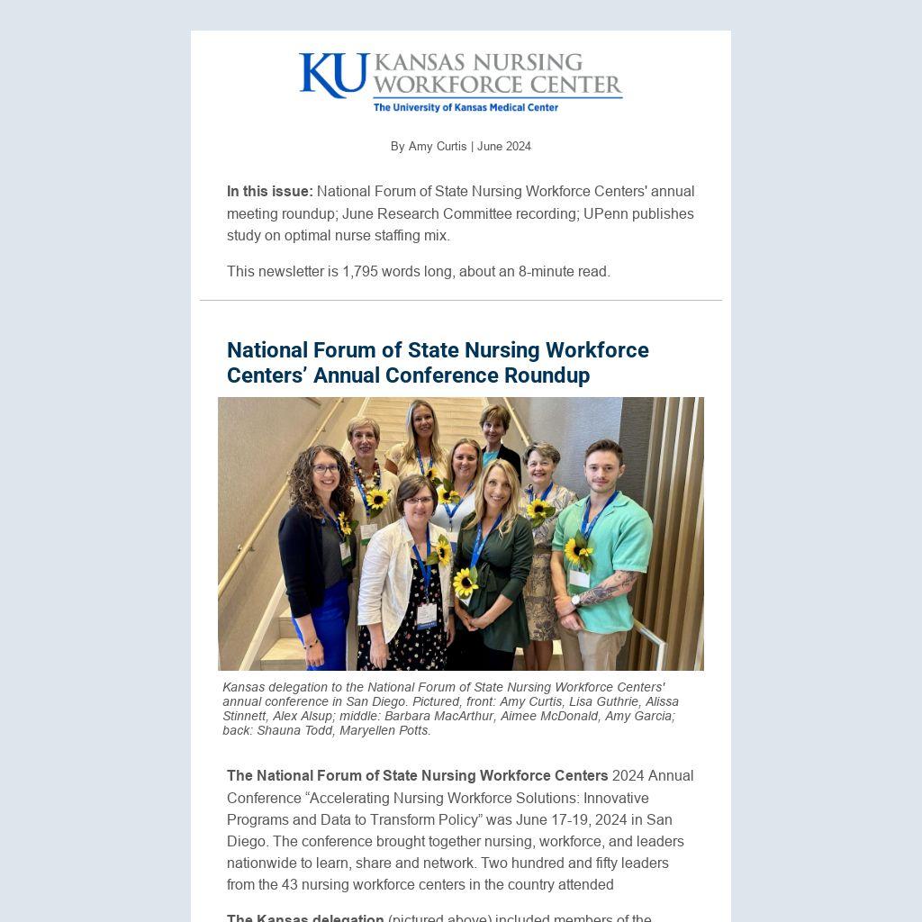 In this issue: National Forum of State Nursing Workforce Centers' annual meeting roundup; June Research Committee recording; UPenn publishes study on optimal nurse staffing mix.