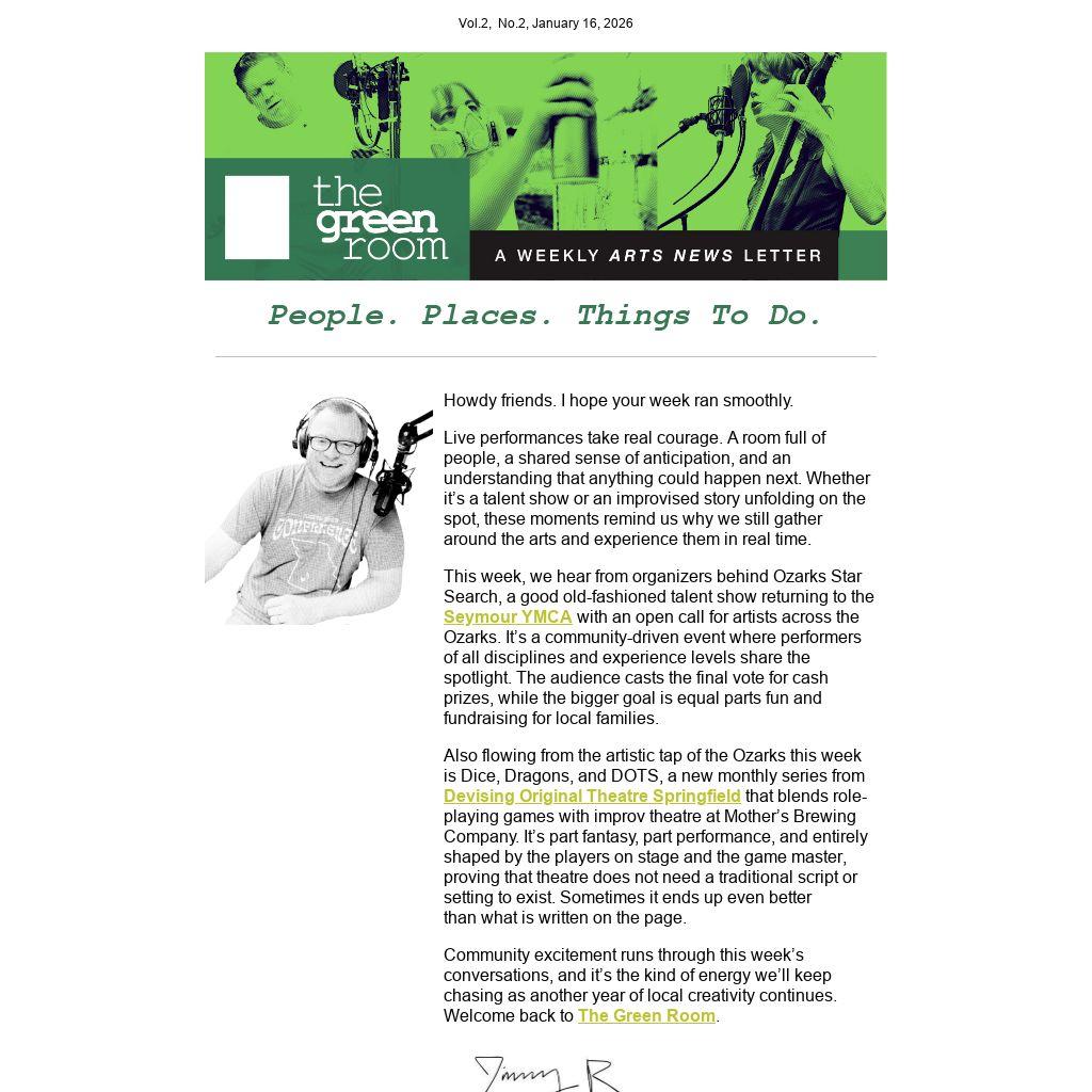 👉Got a story, event, or artist I should know about? Share your arts and music tips with The Green Room, and help us shine a spotlight on the creative pulse of the Ozarks! You can email them to me at JRea@MissouriState.edu.