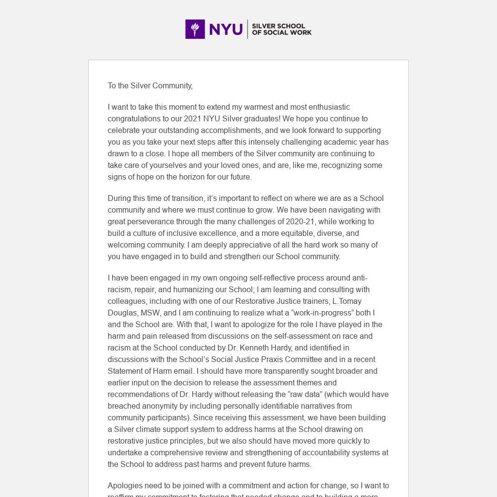 I have been engaged in my own ongoing self-reflective process around anti-racism, repair, and humanizing our School; I am learning and consulting with colleagues, including with one of our Restorative Justice trainers, L.Tomay Douglas, MSW, and I am continuing to realize what a “work-in-progress” both I and the School are. With that, I want to apologize for the role I have played in the harm and pain released from discussions on the self-assessment on race and racism at the School conducted by Dr. Kenneth Hardy, and identified in discussions with the School’s Social Justice Praxis Committee and in a recent Statement of Harm email. I should have more transparently sought broader and earlier input on the decision to release the assessment themes and recommendations of Dr. Hardy without releasing the “raw data” (which would have breached anonymity by including personally identifiable narratives from community participants). Since receiving this assessment, we have been building a Silver climate support system to address harms at the School drawing on restorative justice principles, but we also should have moved more quickly to undertake a comprehensive review and strengthening of accountability systems at the School to address past harms and prevent future harms.