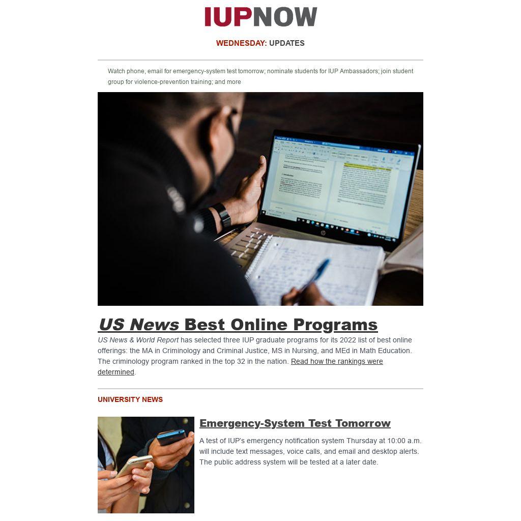 Watch phone, email for emergency-system test tomorrow; nominate students for IUP Ambassadors; join student group for violence-prevention training; and more