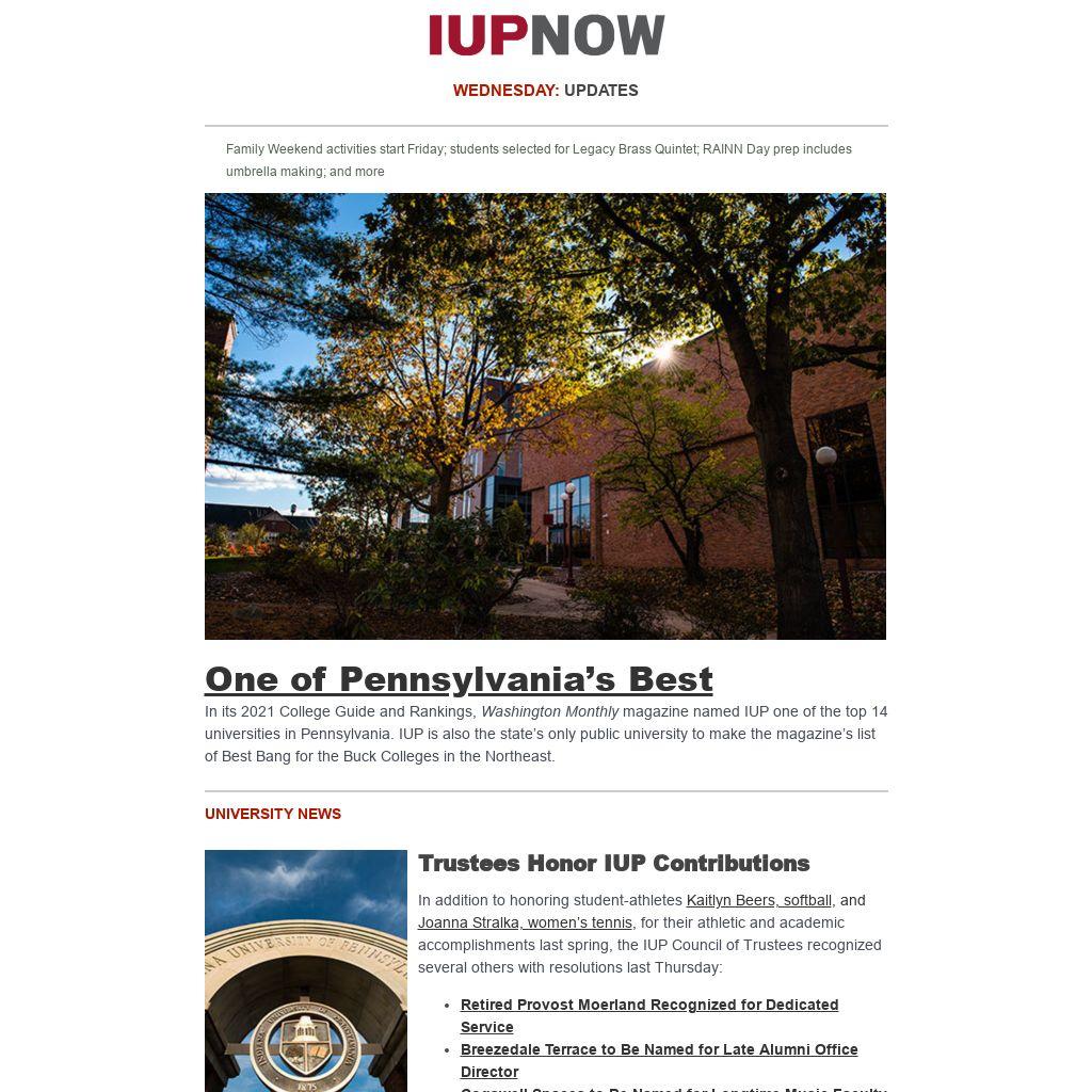 Distributed to IUP employees and students three days a week, IUP Now is the official newsletter of Indiana University of Pennsylvania. It features news from across the IUP website, compiled by the Division of Marketing and Communications. Find out how to get your news and events in IUP Now.