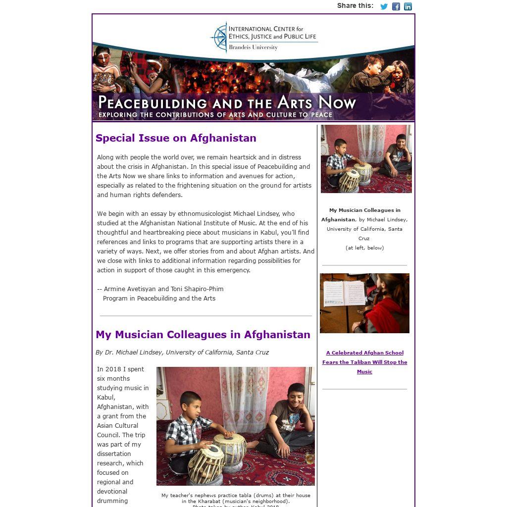 Along with people the world over, we remain heartsick and in distress about the crisis in Afghanistan. In this special issue of Peacebuilding and the Arts Now we share links to information and avenues for action, especially as related to the frightening situation on the ground for artists and human rights defenders.
