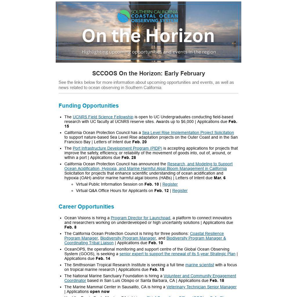 - Feb. 11: California Sea Grant and the California Ocean Protection council invite you to a public webinar highlighting key results from recent efforts to address ocean acidification and hypoxia (OAH) in coastal California | Register