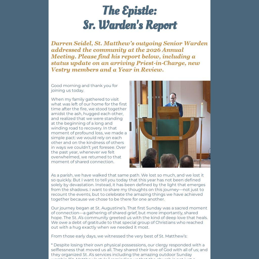 Finally, we take the time at the Annual Meeting to formally vote on our new Vestry members. We have an outstanding group of nominees who will join the group: Cameron Brown, Daniella Winters, Joan Sumpter, and Catherine Carrick. Please welcome them, along with 2025 Junior Warden, Heather Jones, who will now become the 2026 Senior Warden.