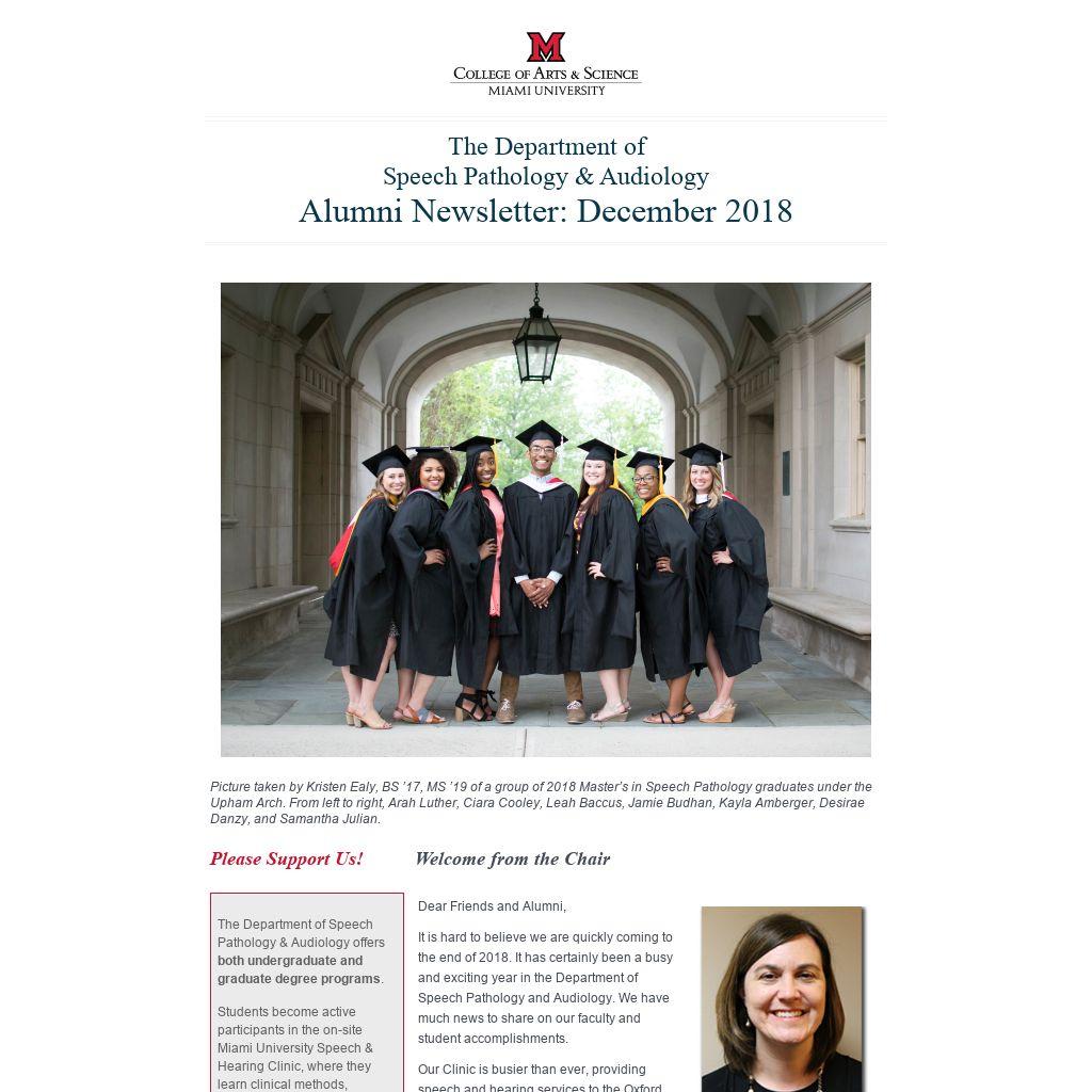 | Dear Friends and Alumni, It is hard to believe we are quickly coming to the end of 2018. It has certainly been a busy and exciting year in the Department of Speech Pathology and Audiology. We have much news to share on our faculty and student accomplishments. Our Clinic is busier than ever, providing speech and hearing services to the Oxford community and beyond. Our students are active in our National Student Speech Language and Hearing Chapter (Dr. Chip Hahn serves as the faculty advisor) and our ASL and Deaf Culture Club (Megan Gross serves as the faculty advisor). This past year, The ASL and Deaf Culture Club brought national talent to Oxford and in November hosted Stacy Abrams, founder of the #whyIsign social media campaign. We welcomed two new full-time faculty members this year and two part-time faculty. You can read more about each of these individuals in this newsletter and on our website. Also in faculty news, Laura Kelly retired after 30 years of service to the Department. As you read through this newsletter, you will find links to our department website. We invite you to explore the website to learn more about what is happening in the department. We have highlighted a couple of alumni and we would love to provide more highlights in the future. Please send your updates and pictures to spa@miamioh.edu. We sincerely love to hear about what you have been doing. We hope that 2018 has been a great year for you and best wishes for the New Year. Please do not hesitate to stop by the Department if your travels bring you to Oxford in the coming year.
