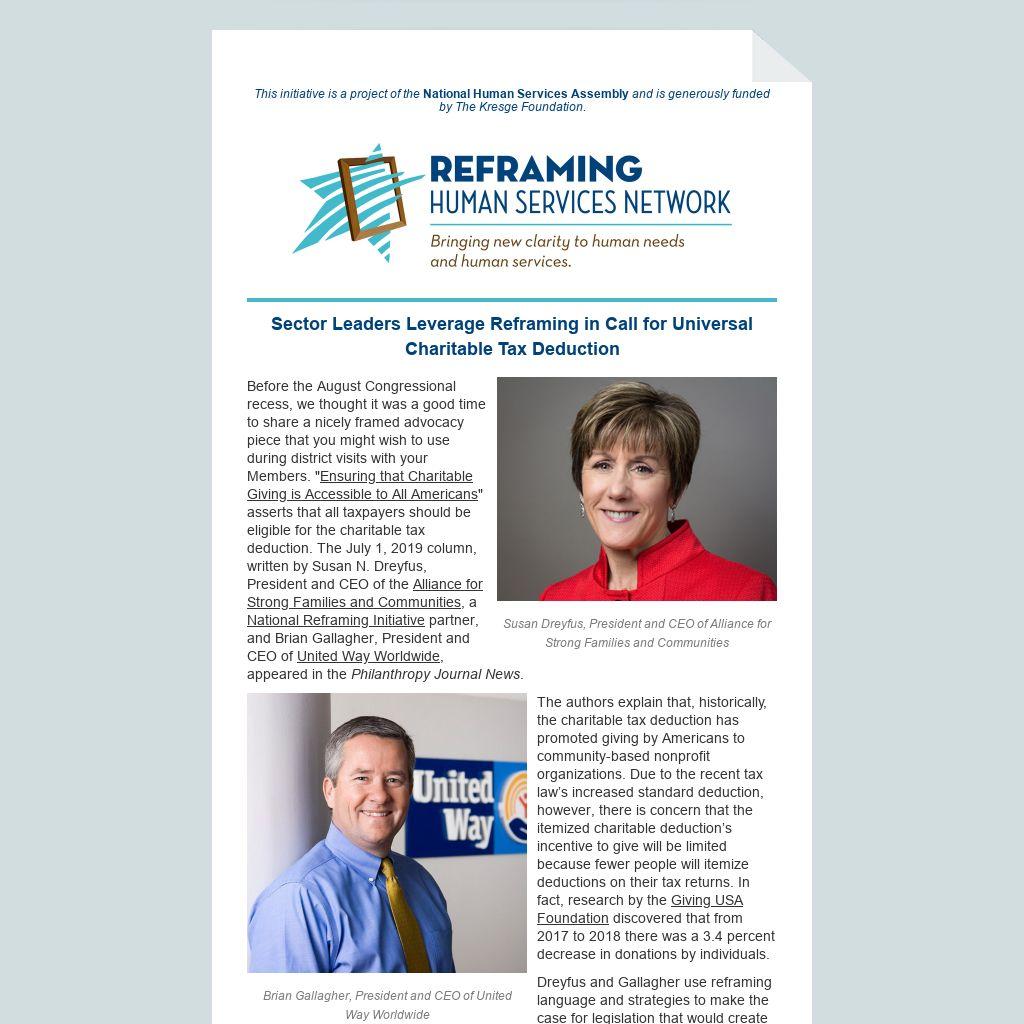 Dreyfus and Gallagher use reframing language and strategies to make the case for legislation that would create a “universal tax deduction” to address this sector-wide problem so that all donors to nonprofit organizations could claim the charitable tax deduction. For instance, the authors: