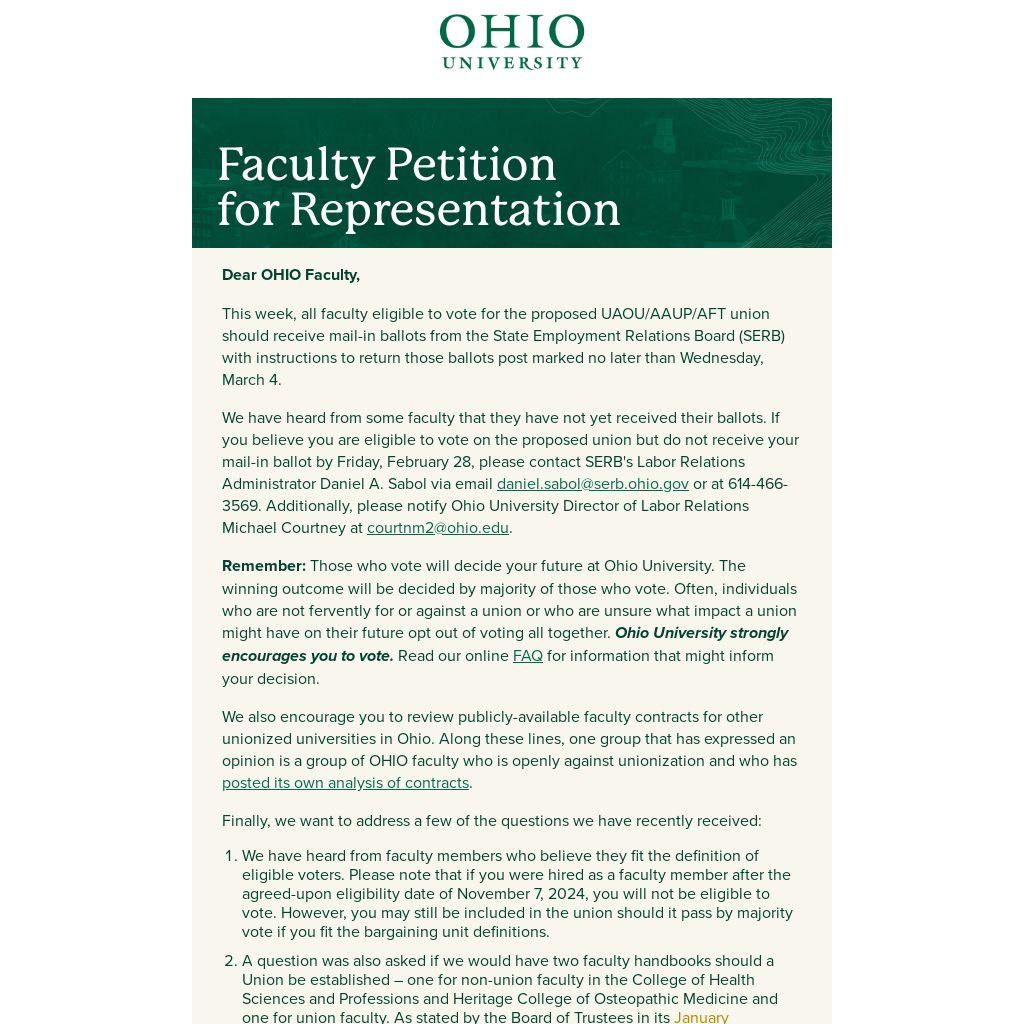 We have heard from some faculty that they have not yet received their ballots. If you believe you are eligible to vote on the proposed union but do not receive your mail-in ballot by Friday, February 28, please contact SERB's Labor Relations Administrator Daniel A. Sabol via email daniel.sabol@serb.ohio.gov or at 614-466-3569. Additionally, please notify Ohio University Director of Labor Relations Michael Courtney at courtnm2@ohio.edu.