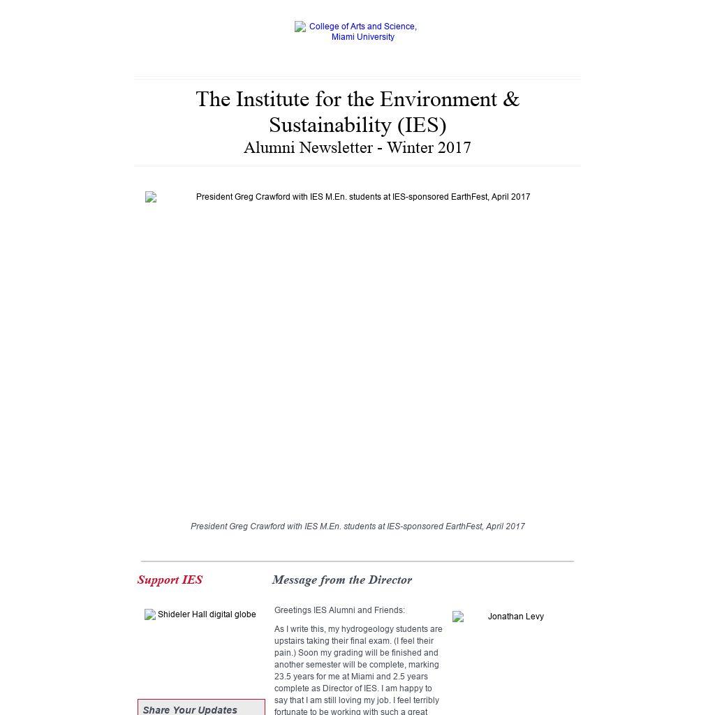 | Greetings IES Alumni and Friends: As I write this, my hydrogeology students are upstairs taking their final exam. (I feel their pain.) Soon my grading will be finished and another semester will be complete, marking 23.5 years for me at Miami and 2.5 years complete as Director of IES. I am happy to say that I am still loving my job. I feel terribly fortunate to be working with such a great group of faculty, staff, students, alumni and affiliates all dedicated to the mission of IES. In October, IES underwent program review, a great opportunity for self-reflection. The review comprises a retrospective self-study and a strategic plan for the next five years. At the time of this writing, we are still waiting for our final review from the team of internal and external reviewers, but the strategic planning process has been of great value, bringing our specific goals into focus with the help of our Advisory Board, Executive Committee, IES faculty and staff and our graduate students. One of our goals is to expand IES’s partnerships with local communities, especially historically underserved communities. To that end, in 2018, we will begin collaborating with the US EPA College/Underserved Community Partnership Program (CUPP). Michael Burns, the CUPP National Program Manager, will be visiting Miami at the end of February, coordinating meetings with Miami faculty and local communities. IES has a long history of student-driven projects for local communities, but with help from the US EPA we hope to increase our local footprint and address the inseparable issues of social justice and environmental sustainability. In 2017, we made our Willeke lecture part of that social justice theme. We hosted Dr. Elizabeth Hoover from Brown University who shared her research and insights on environmental reproductive justice in a Mohawk community and its connection to colonialism. Dr. Hoover also spoke about food sovereignty in American Indian Communities. I am thrilled to announce that for our next Willeke lecture we continue to explore the connections between the environment, health and justice. Following a year of health care news, we will host MacArthur Fellow, Gary Cohen, the President and Executive Director of Health Care without Harm, an organization dedicated to transforming the health sector to make it “ecologically sustainable and a leading advocate for environmental health and justice.” I hope you can all join us on Thursday, February 15 at 6:00 pm for this exciting event. There is so much more that will be happening in 2018. We truly hope you stay in touch and get involved in IES. I know we can use your help in many ways. We’d love to have you share your wisdom and experiences with students, give us recommendations for local projects, and of course contribute financially to the IES mission of educating students as professionals and global citizens to promote a more sustainable society. Contributions to that end could be used for supporting our Willeke Lecture series, funding our new community-based initiatives and scholarships for our international and diverse-domestic graduate students, to help them earn their M.En. degrees and spread their unique interdisciplinary perspectives across the country and the globe. Just let us know, and we can make sure that your donation will be used for the initiative you’d most like to support. I sincerely thank all of our alumni, staff, faculty, affiliates and students who share our mission, and I look forward to an exciting and fruitful year. All the best,